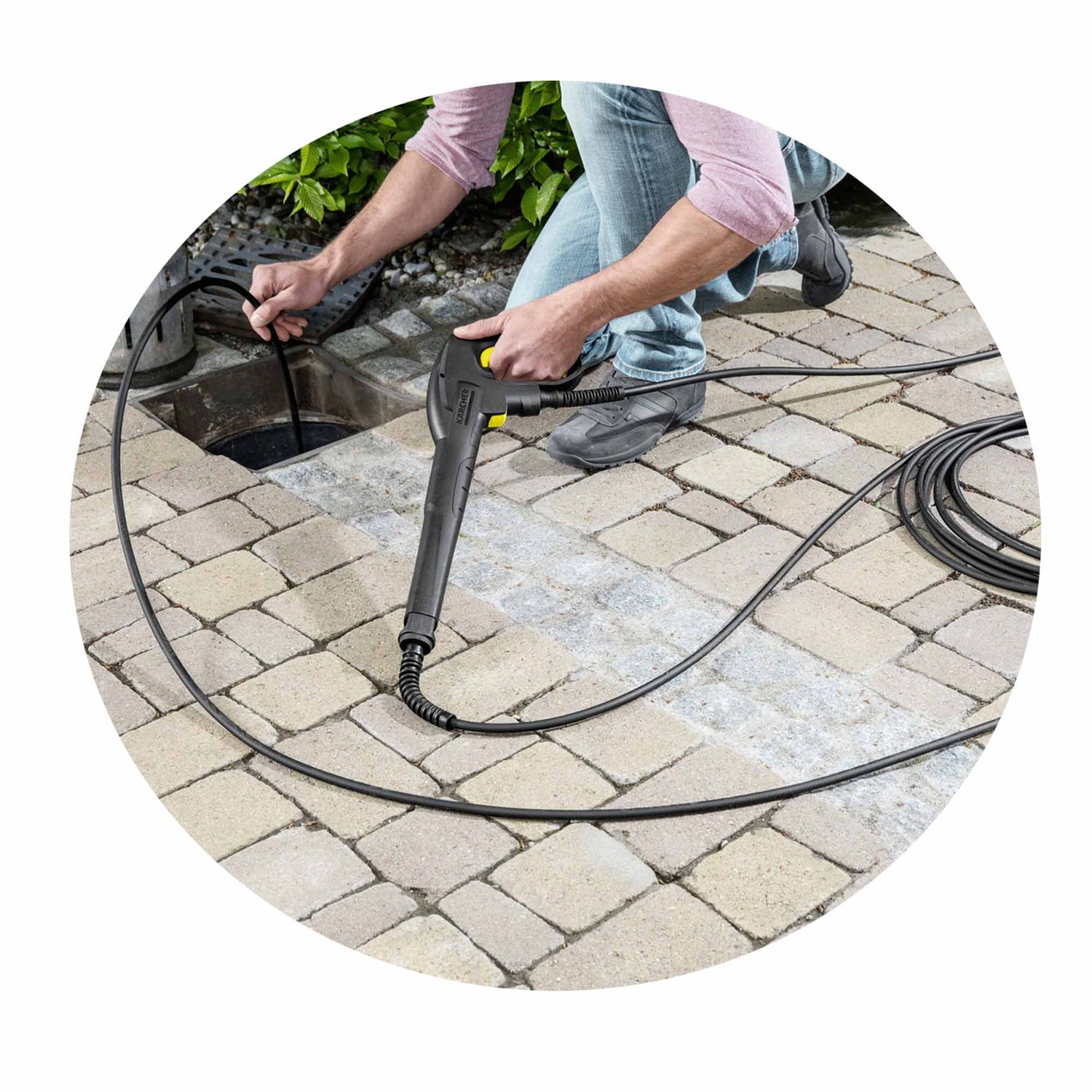 El Juego de desatascador Karcher de 7,5 m Es el accesorio ideal para eliminar atascos de tuberías, desagües y canalizaciones de forma rápida y eficaz. Gracias a los cuatro potentes chorros de alta presión, la manguera se desliza fácilmente por las tuberías, liberándolas de los bloqueos más persistentes. Fabricado con materiales de alta calidad, como la manguera de tela trenzada flexible y la boquilla de latón extra corta, este accesorio es compatible con todas las hidrolimpiadoras. Kärcher del rango de K 2 a K 7.