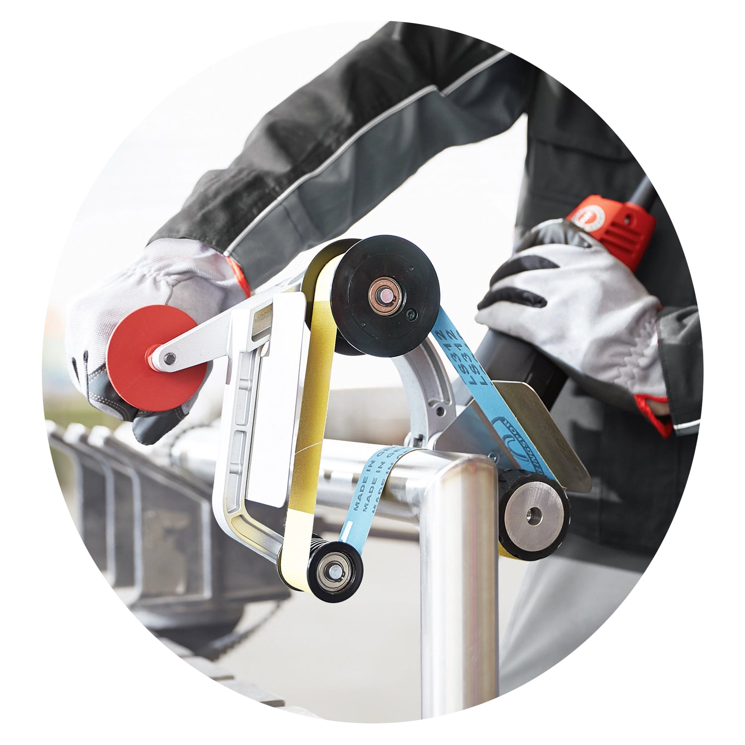 - Para el procesamiento óptimo de diversos materiales, para satinar, estructurar, pulir, cepillar, alisar, desoxidar y desbarbar superficies de acero y acero inoxidable.