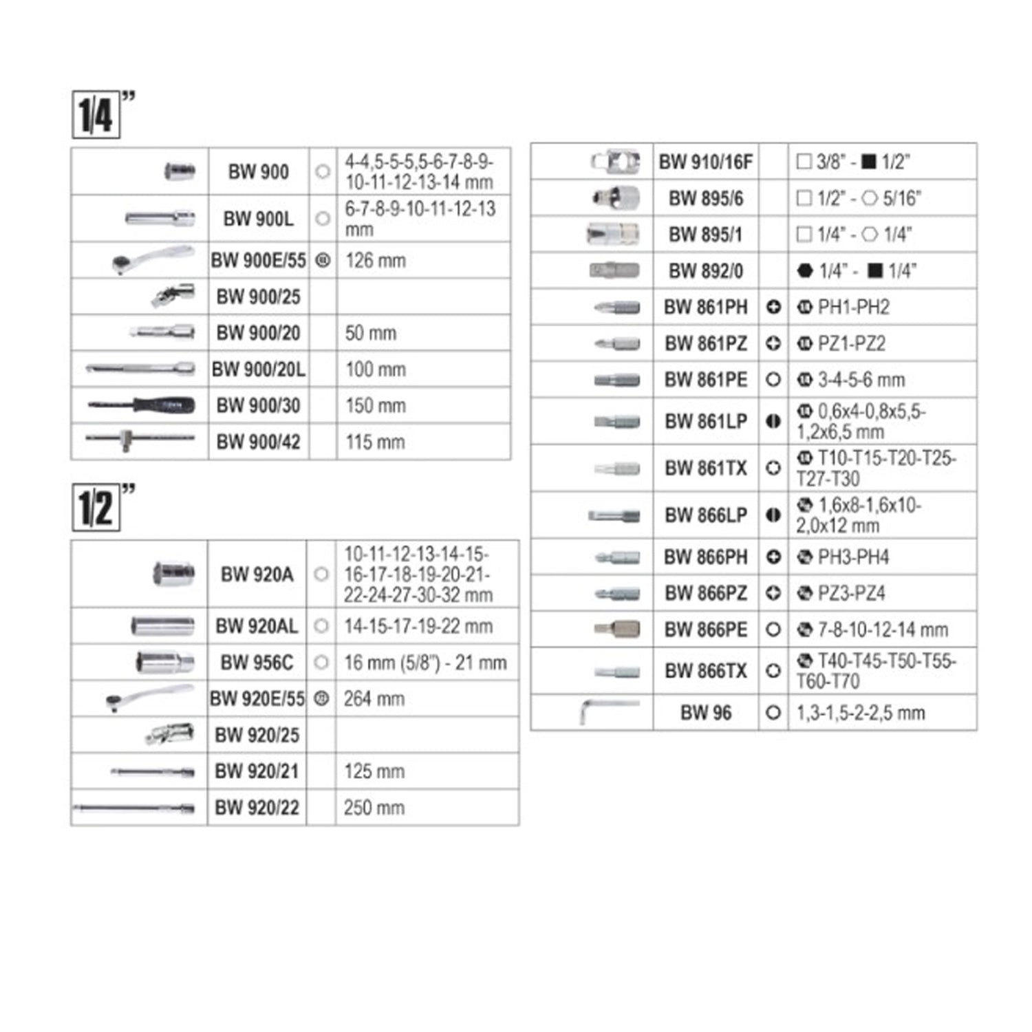 Allá Estuche para llaves Beta BW903E/C98 Es el surtido ideal para profesionales que necesitan un juego completo de llaves de vaso, insertos y accesorios, todo contenido en un resistente estuche de plástico. Con un total de 45 llaves hexagonales, 35 puntas de destornillador y numerosos accesorios, este juego ofrece una versatilidad excepcional, perfecta para trabajos de mantenimiento y precisión.