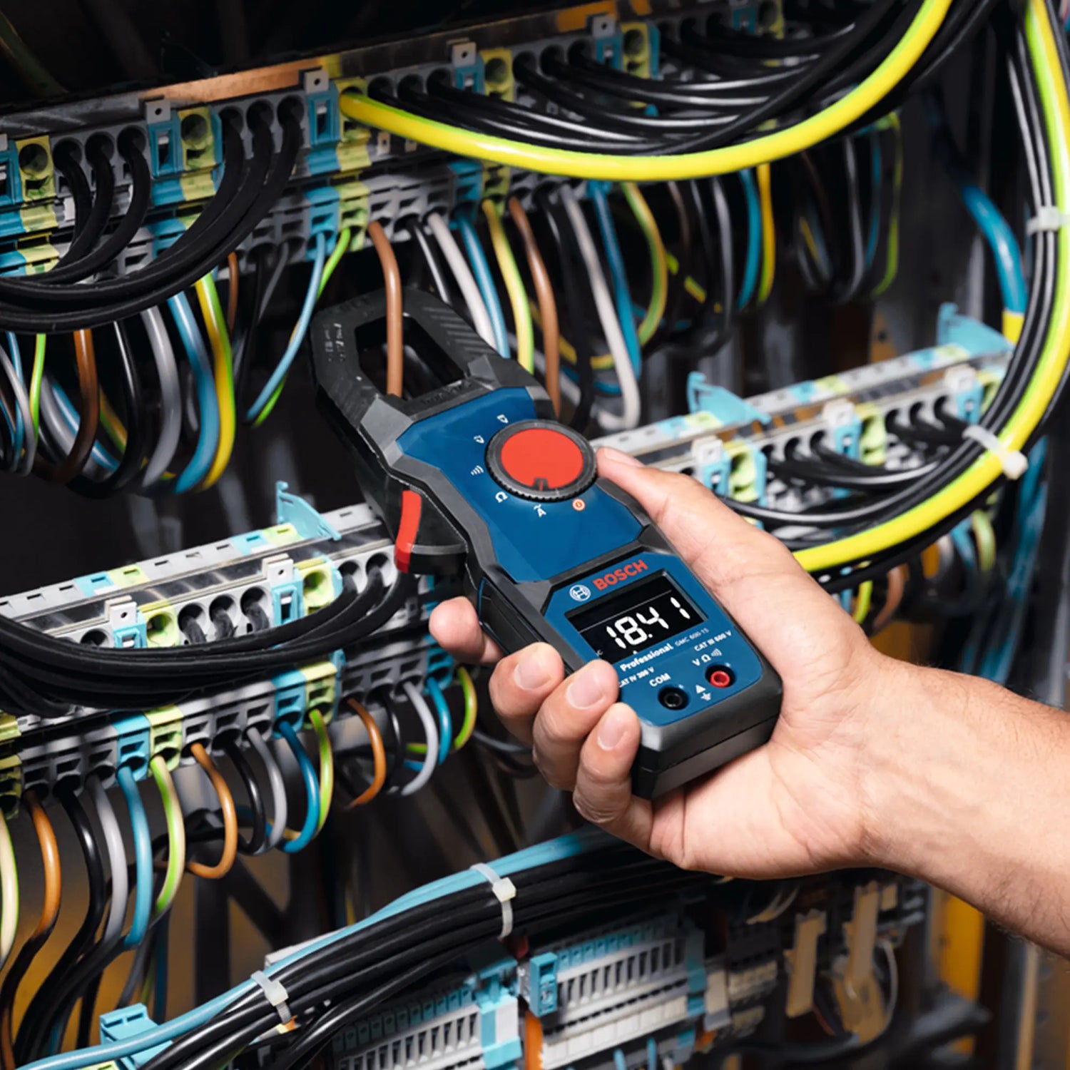 La pinza amperimétrica Bosch GMC 600-15 True RMS eficiente y robusto con pantalla LCD invertida para lecturas precisas.