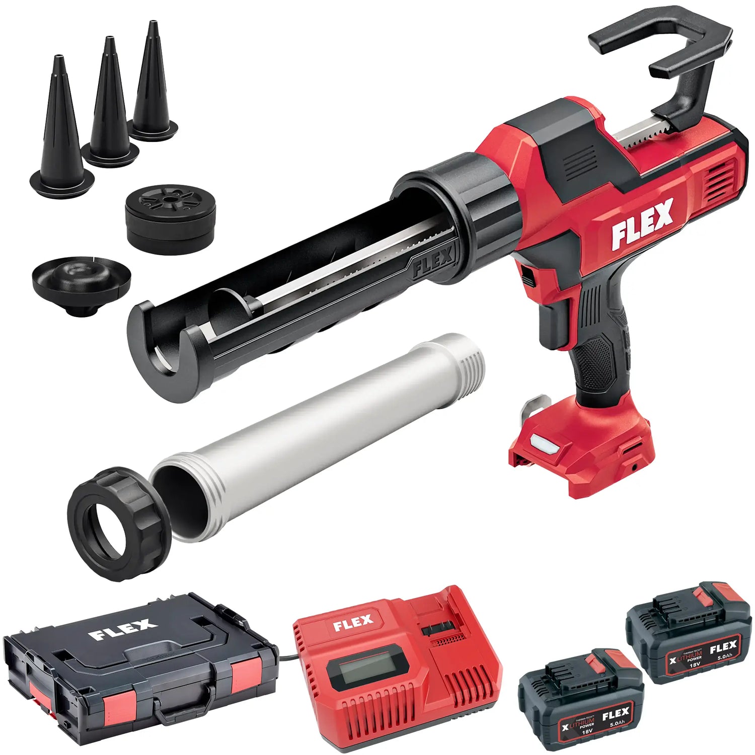La pistola de silicona Flex CG 310/600 + P-Set 55 R Batería compacta de 18 V y 5 Ah para cartuchos de 310 ml y bolsas de 300-600 ml.