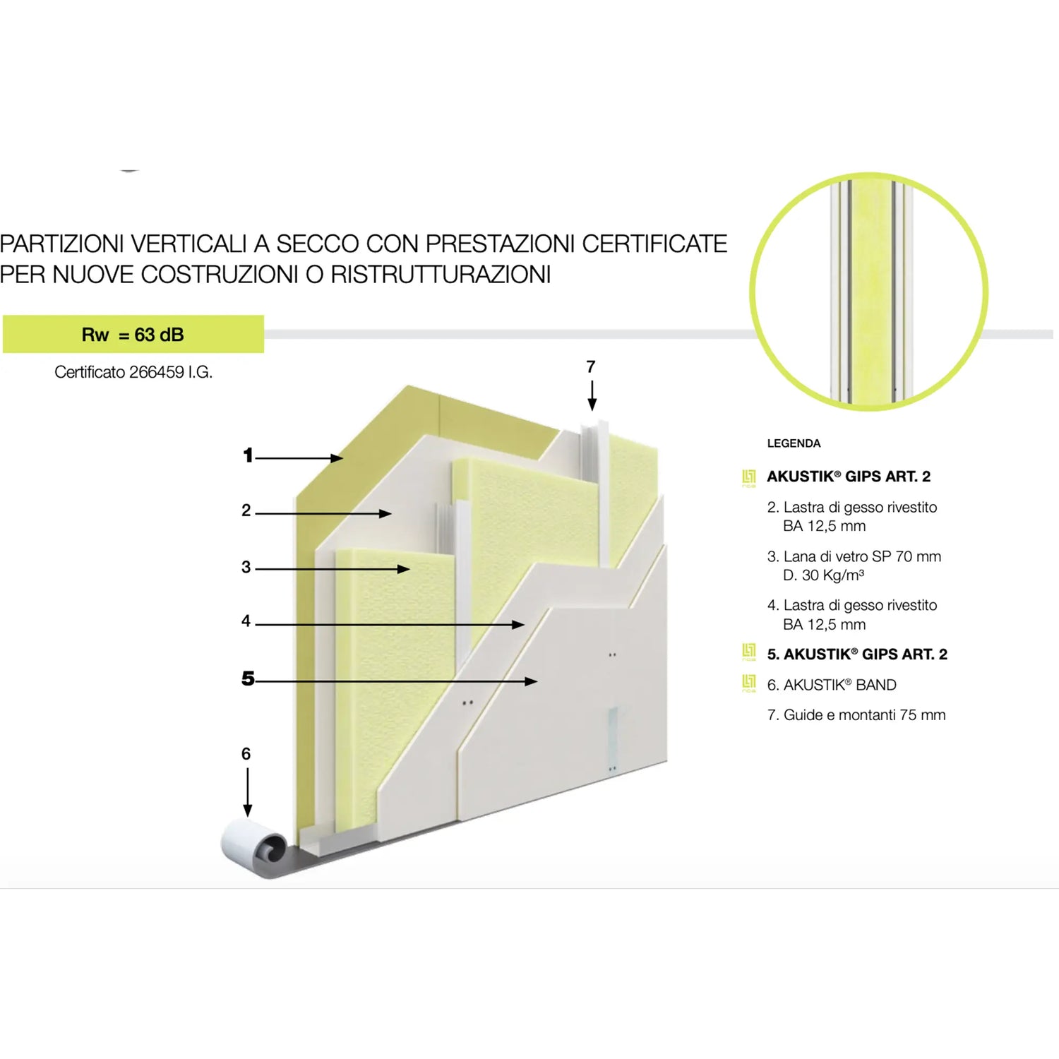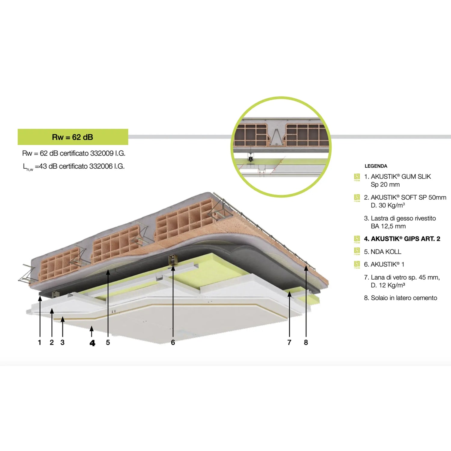 El Panel acoplado NDA Akustik Gips Art2 Es la solución ideal para obtener Alto rendimiento de aislamiento acústico En paredes de pladur, falsos muros y falsos techos. Este especial placa de doble capa Se compone de un panel en Placa de yeso de 12,5 mm acoplado con un Masa insonorizante y antivibratoria TECSOUND® EPDM 2,5 mm, con una densidad de 5 kg/m².