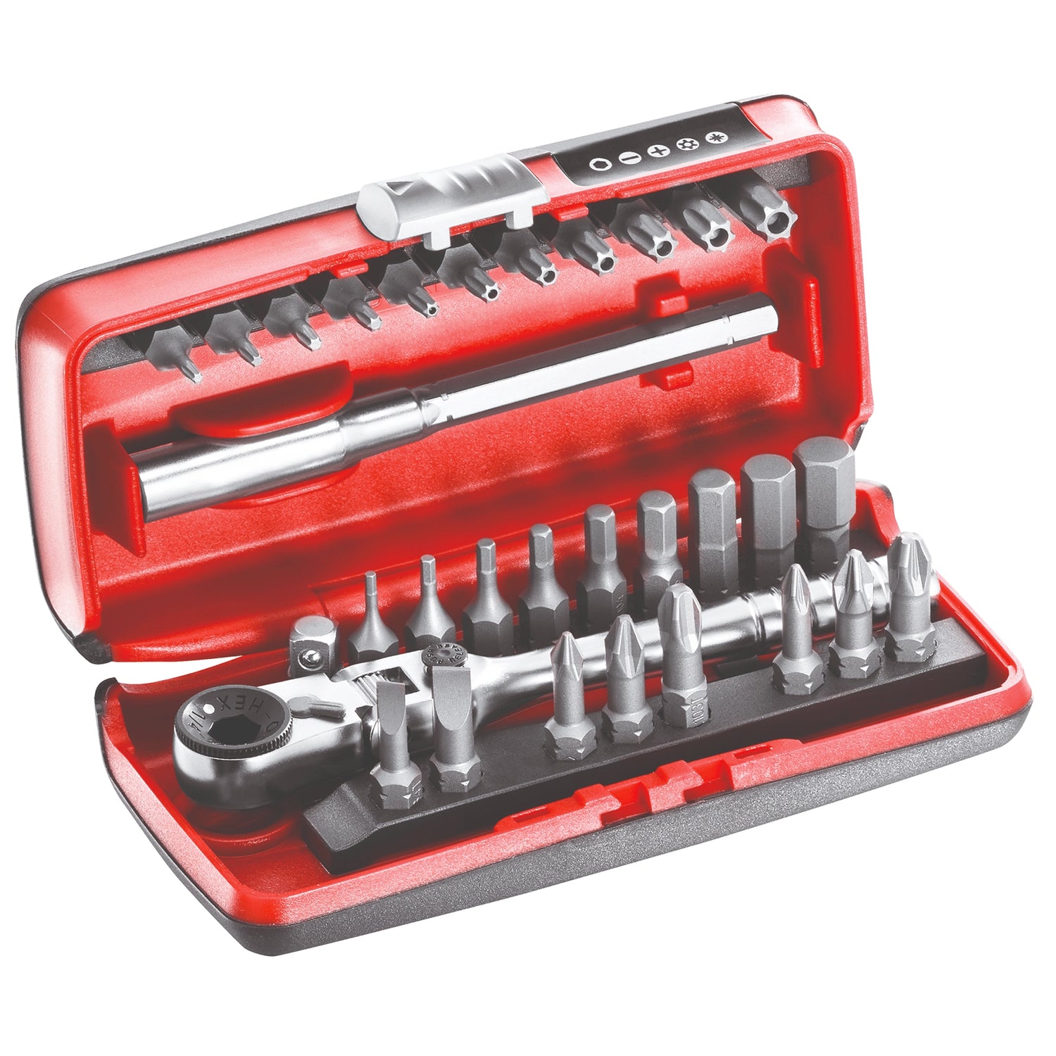 • Portapuntas de trinquete reversible:Permite realizar atornillados rápidos y sin esfuerzo. El sistema reversible permite invertir rápidamente la dirección de trabajo.