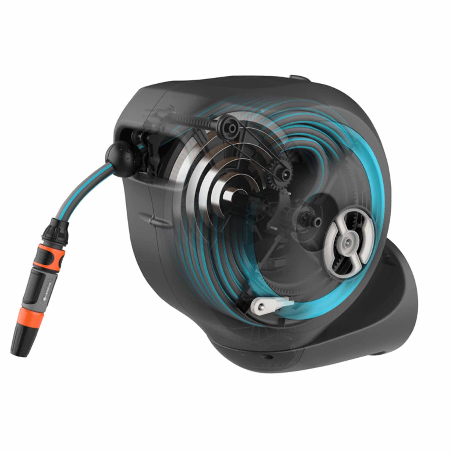 • Automatic retractable: Thanks to the integrated steel spring and RollControl technology, the hose rewinds smoothly and in a controlled manner with a light pull.