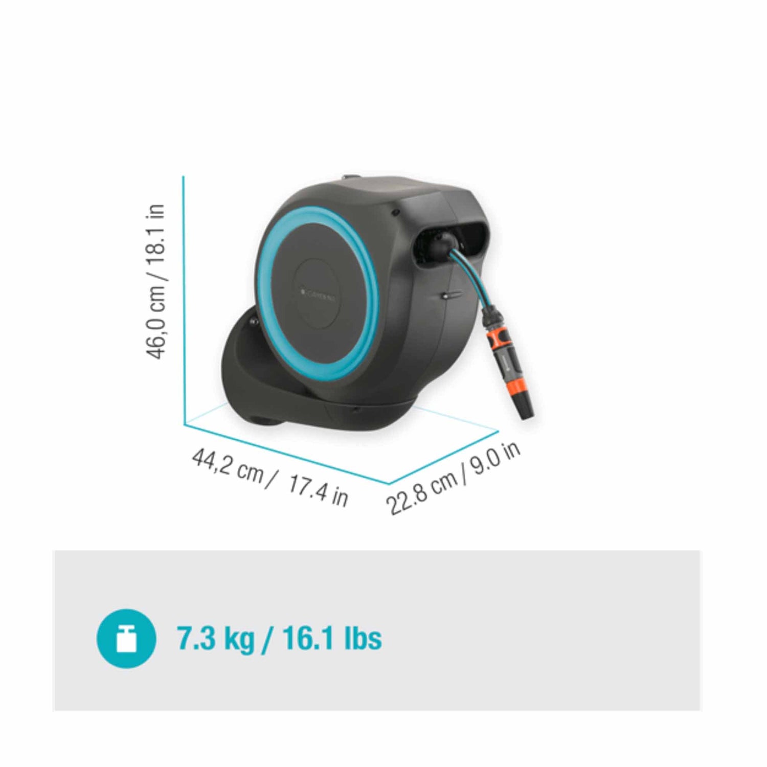• Weather resistance: Made of UV and frost resistant materials, the hose reel can remain installed outside all year round.