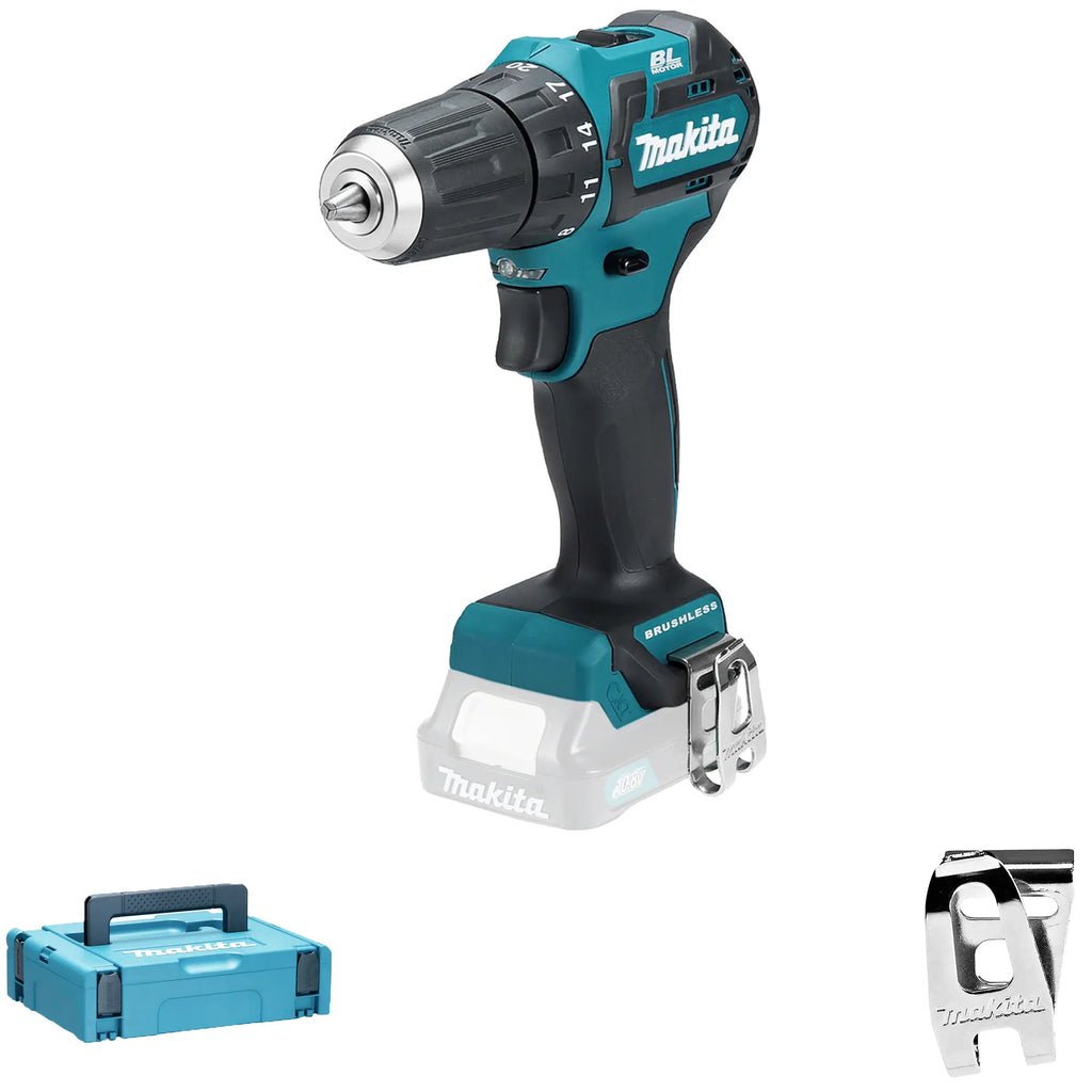 Drill Driver Makita DF332DZJ 12V with high-performance brushless motor with ultra-compact design and self-tightening chuck Ø max 10mm.
