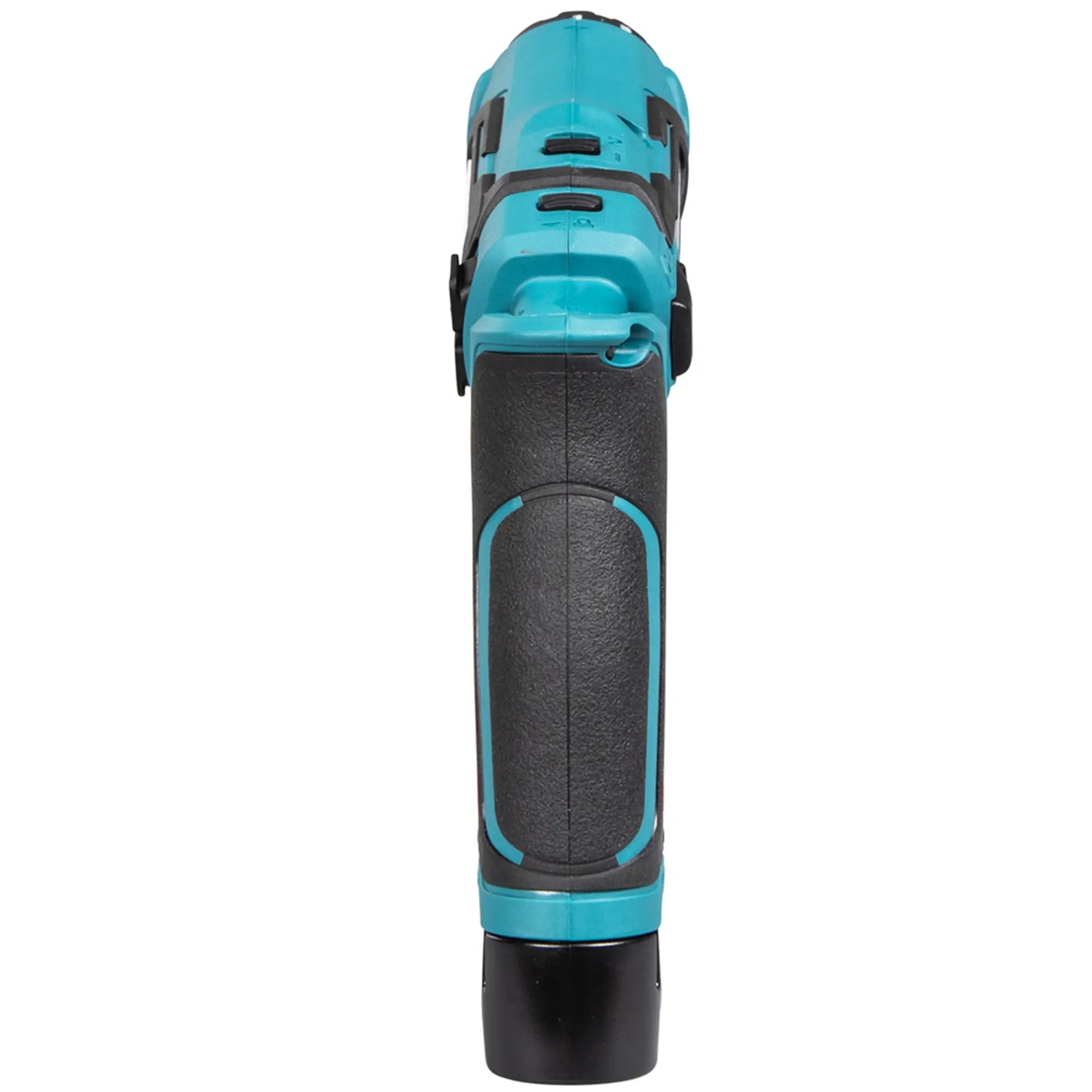Avvitatore Makita DF012DSJ 7,2V 1.5Ah con attacco 1/4" femmina con luce led, può essere utilizzato sia come avvitatore diritto sia come avvitatore a pistola.