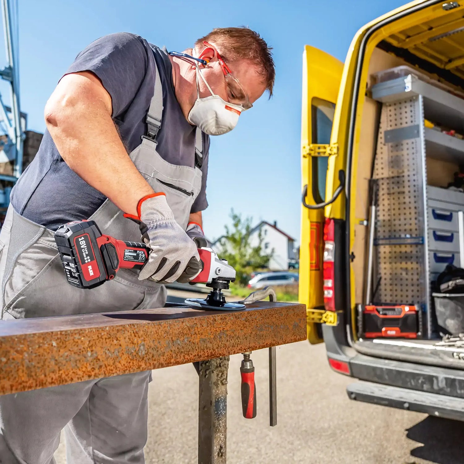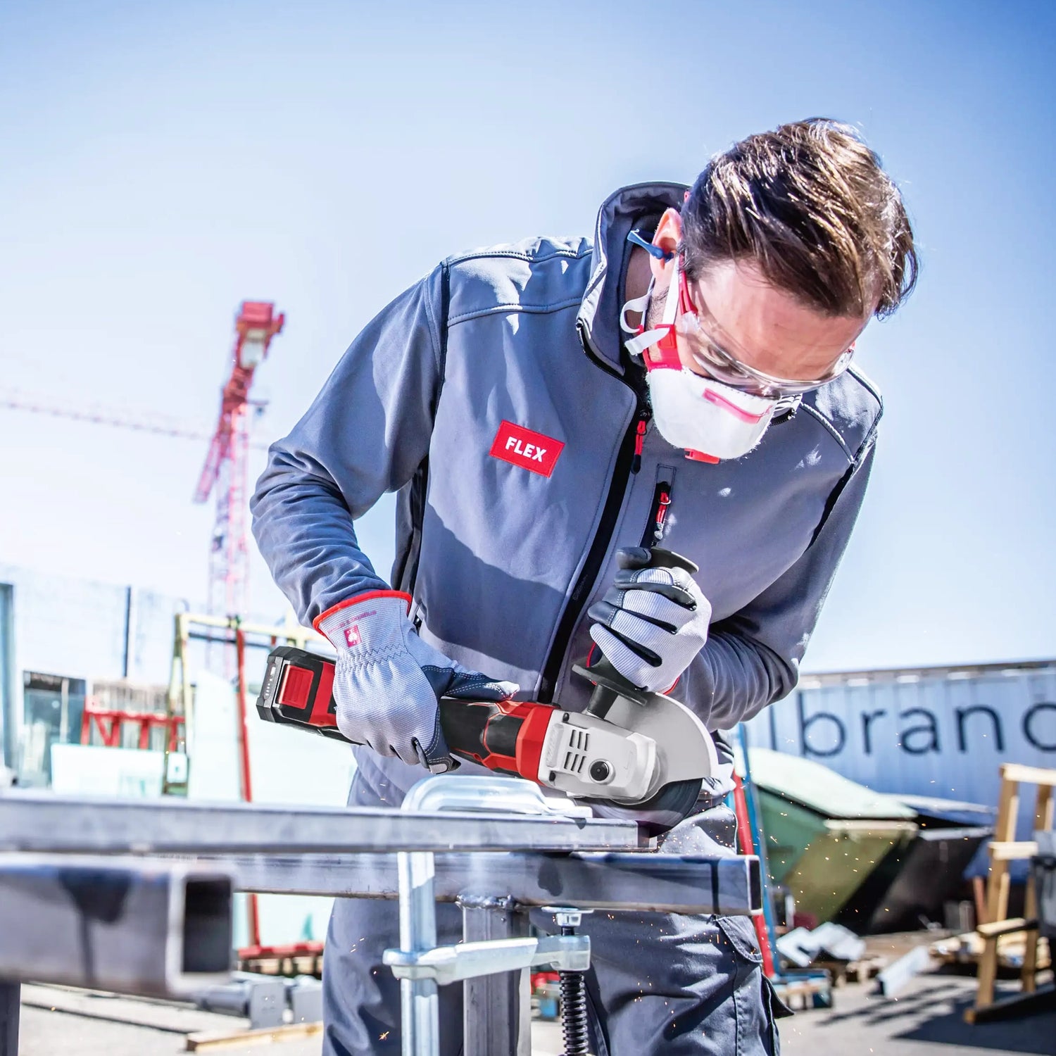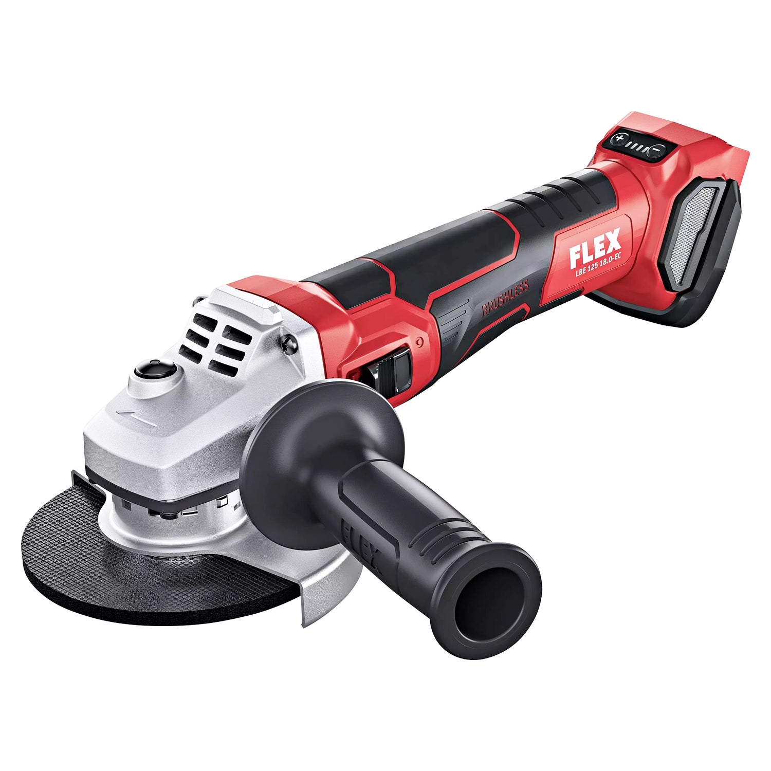 Amoladora angular Flex LBE 125 18.0-EC C Funcionamiento a batería con velocidad variable y freno 18,0 V, 125 mm. El Sistema de Gestión Electrónica (EMS) protege la máquina, prolongando su vida útil y aumentando su eficiencia.