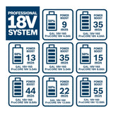 • Carga ultrarrápidaGracias a la potente corriente de carga, una batería ProCORE18V 8.0Ah se puede cargar hasta el 50% en solo 15 minutos y hasta el 80% en 32 minutos.
