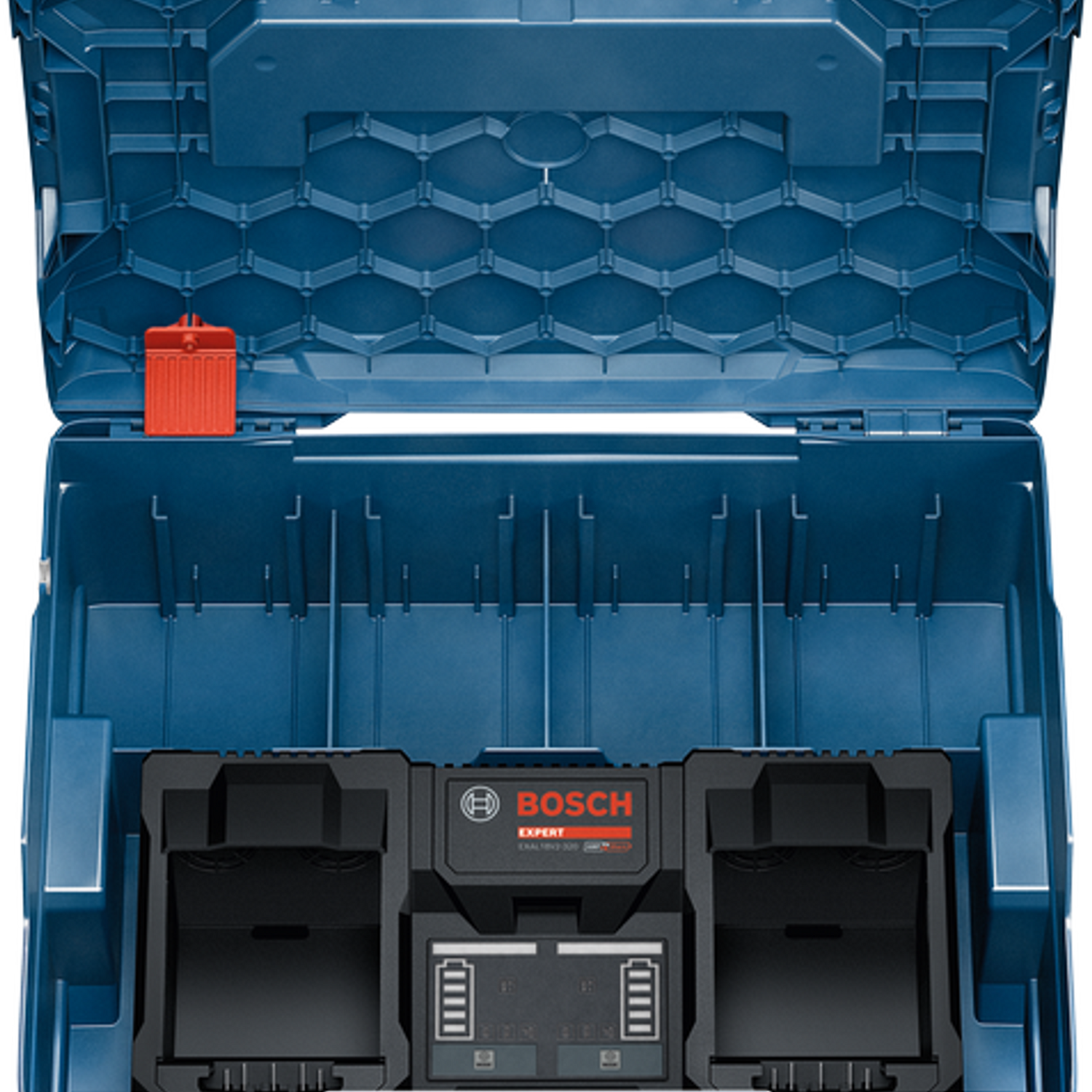 Cargador de batería Bosch EXAL18V2-320 Carga paralela ultrarrápida de 18 V para 2 baterías en 39 minutos con el sistema L-BOXX integrado.