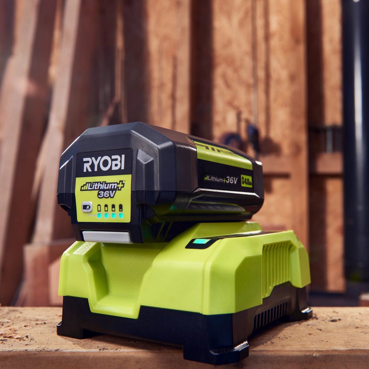 Cargador de batería Ryobi RY36C60A 36V más potente. Carga completamente una batería de 5,0 Ah en 1 hora. Cargador compatible con todas las baterías de 36 V Ryobi.
