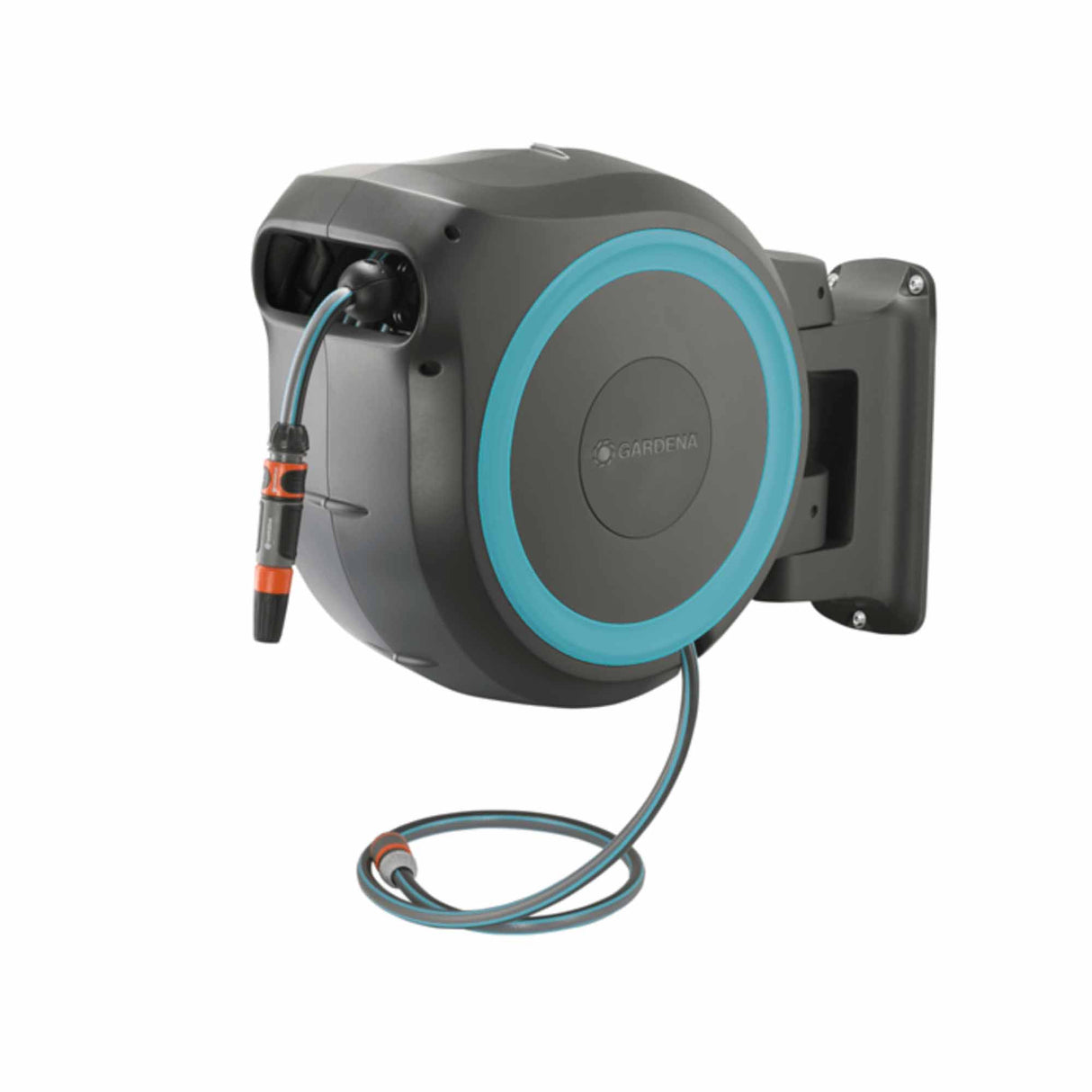Carrete de manguera montado en la pared Gardena Enrollable M/L, para jardines más grandes con el carrete de manguera de montaje en pared RollUp M/L.