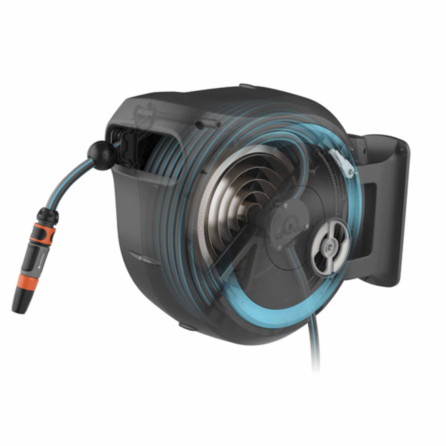 • Rebobinado automático y seguro:Un ligero tirón libera la manguera, que se enrolla de forma automática y uniforme gracias al resorte de acero de alta calidad. La tecnología RollControl garantiza una retracción segura y controlada, evitando arrugas o nudos.
