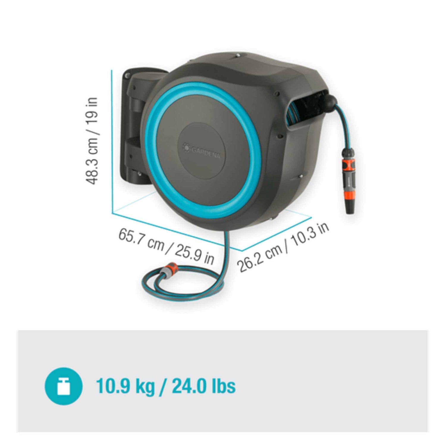 EL'carrete de manguera de jardín Gardena Enrollable M/L Es la elección ideal para quienes buscan practicidad y comodidad en el riego del jardín. Con capacidad para 25 metros de manguera, permite gestionar el riego sin complicaciones, gracias a su diseño ahorrador de espacio y fácil instalación en pared. Este avanzado sistema te permite decir adiós a las mangueras enredadas y a las manos sucias, ofreciendo máxima eficiencia y orden en tu jardín.