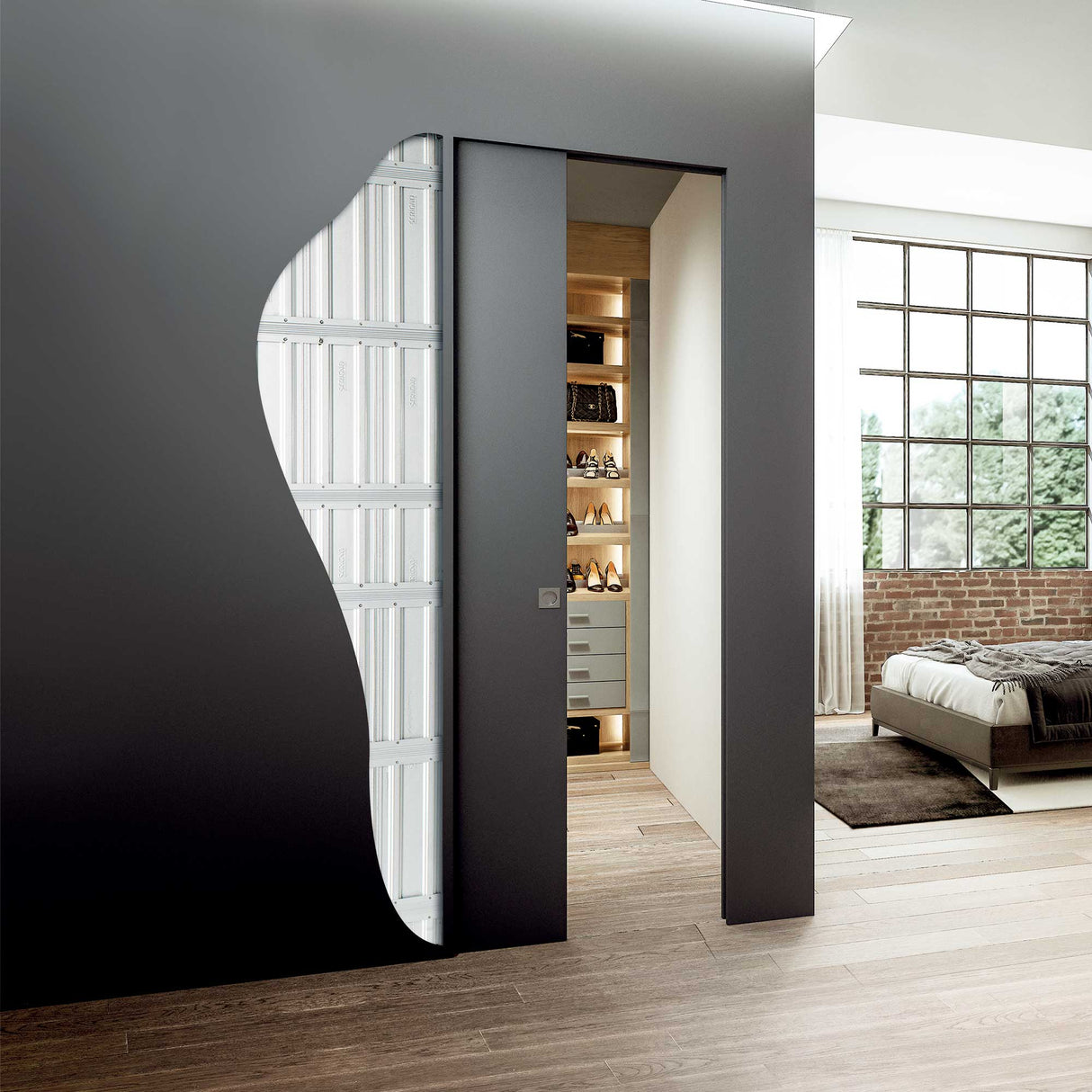 La marca Essential De Scrigno, conocido por su sistema Puerta de pared, permite obtener puertas correderas y batientes que desaparecen por completo, dejando una pared libre de elementos externos y garantizando fluidez y continuidad entre los entornos.
