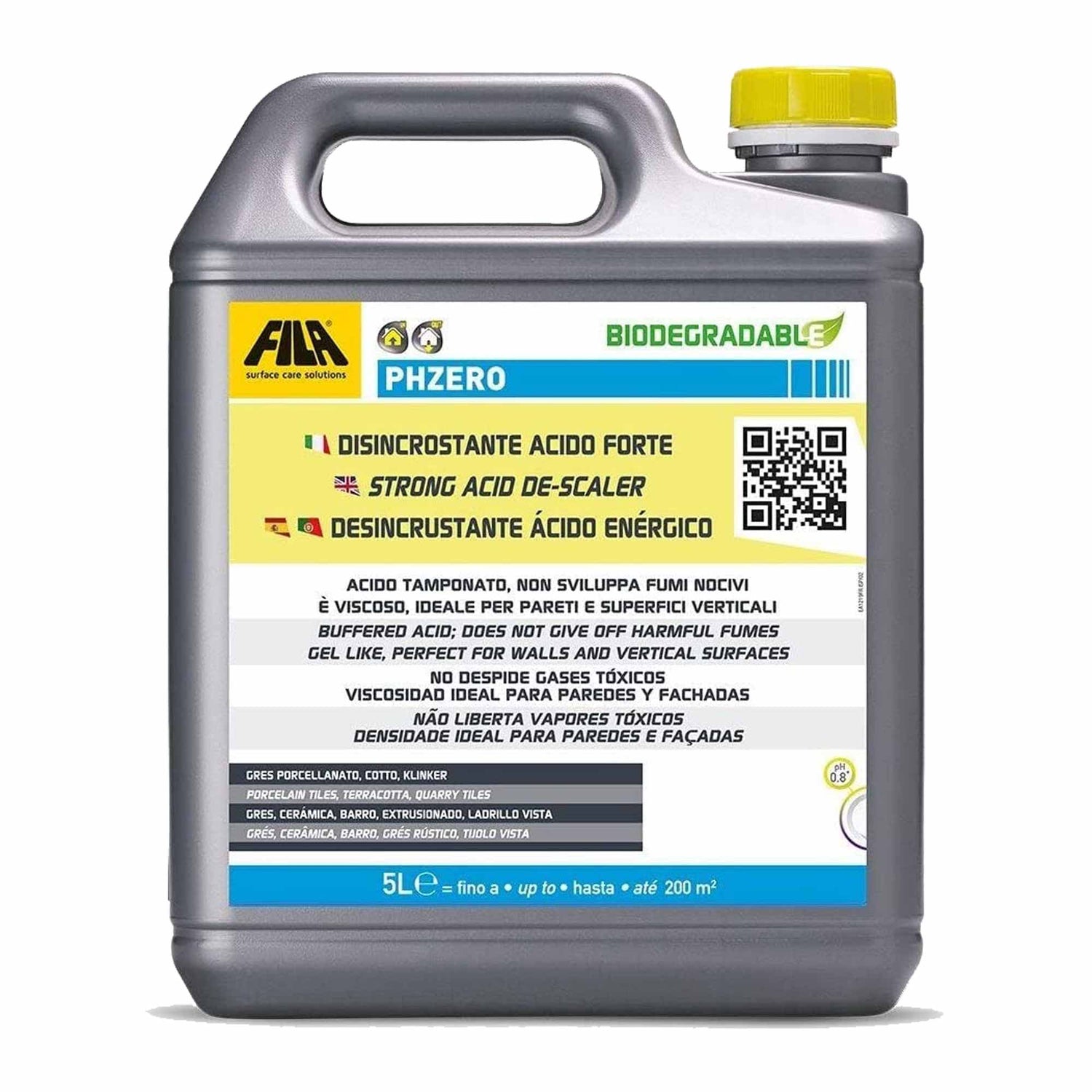 El Descalcificador de ácido fuerte Fila PHZERO Es el detergente ideal para eliminar la suciedad más persistente en superficies como barro, klinker y gres porcelánico. Su fórmula concentrada lo hace especialmente eficaz para eliminar residuos de construcción, eflorescencias salinas e incrustaciones donde otros detergentes fallan. Disponible en Bidón de 1 litro, este descalcificador garantiza una limpieza profunda y profesional.