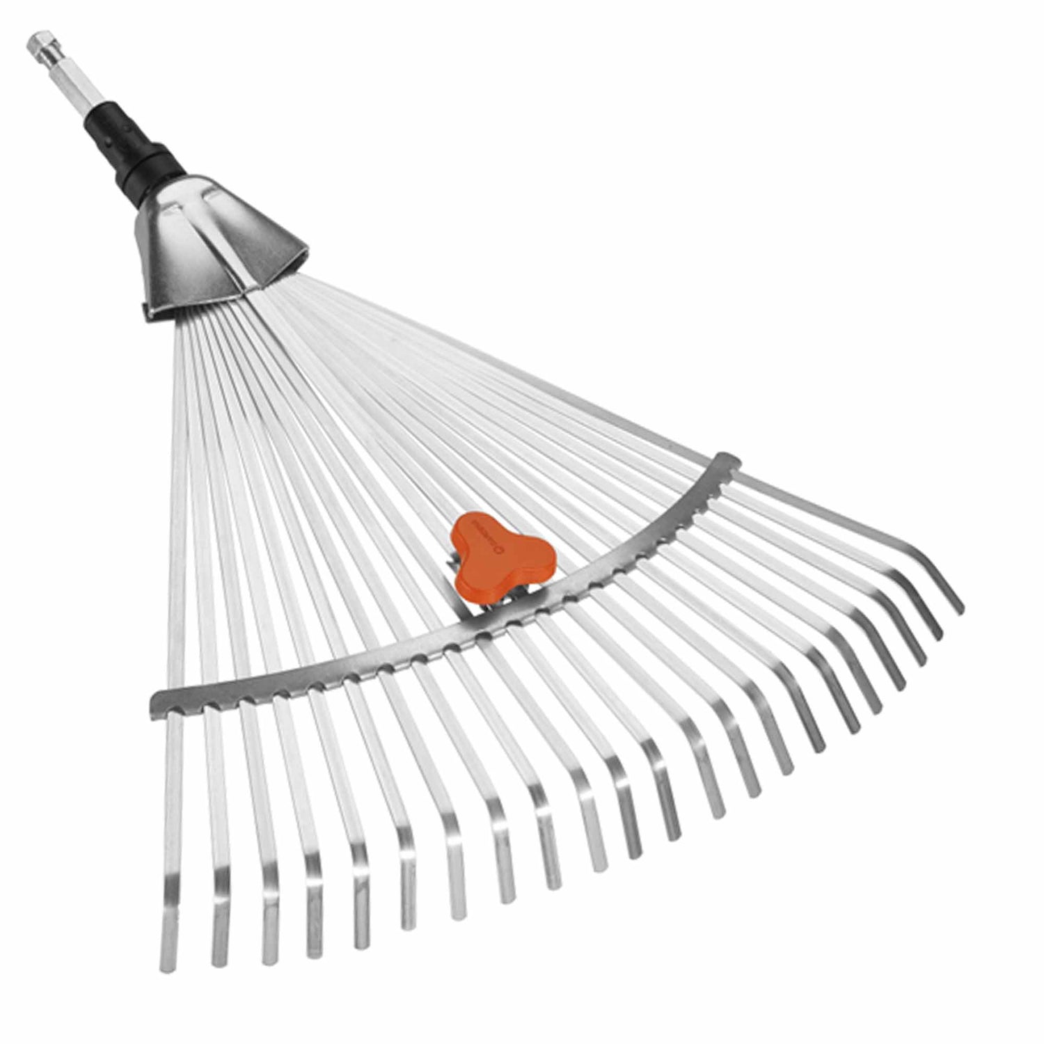 Escoba de césped ajustable Gardena En acero Combisystem Es especialmente adecuado para recoger hojas, restos de césped y otros residuos de jardín. La distancia entre los dientes de acero elástico galvanizado, flexible y resistente a la oxidación se puede ajustar fácilmente.