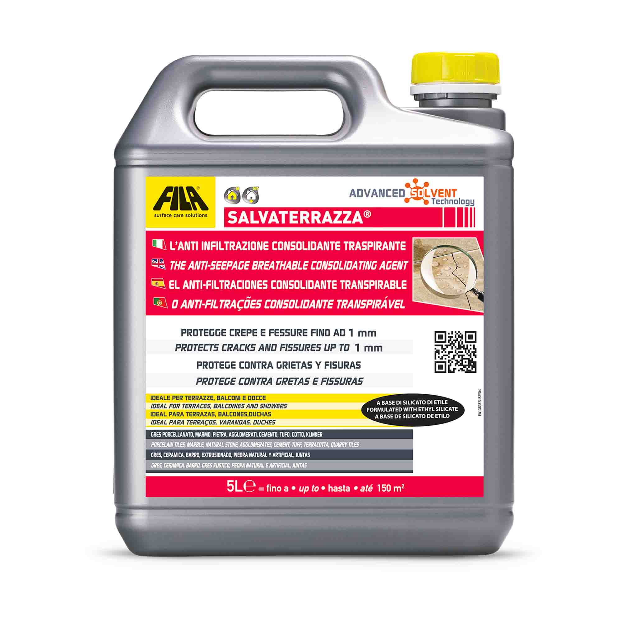 Línea SALVATERRAZZA Es un producto impermeabilizante consolidante y transpirable, perfecto para la protección de superficies en gres porcelánico, mármol, piedra, aglomerados, hormigón, toba, terracota y klinker. Si desea evitar infiltraciones de agua y daños, este producto es la solución perfecta para el mantenimiento y consolidación de terrazas, pavimentos exteriores y superficies de paredes.