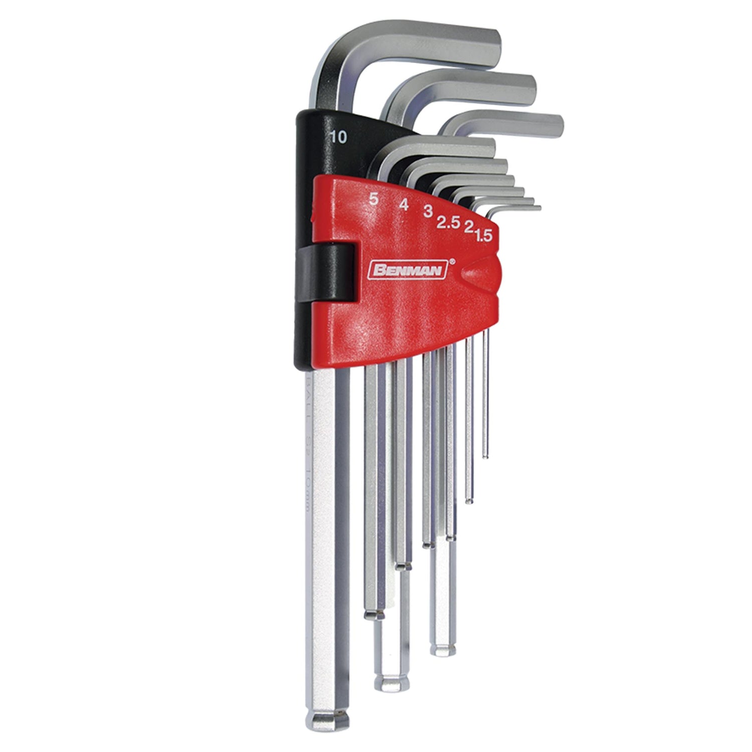 Juego de llaves hexagonales largas Benman 9 piezas, con cabezal turbal patentado que combina un cabezal recto con un cabezal tipo turbal.