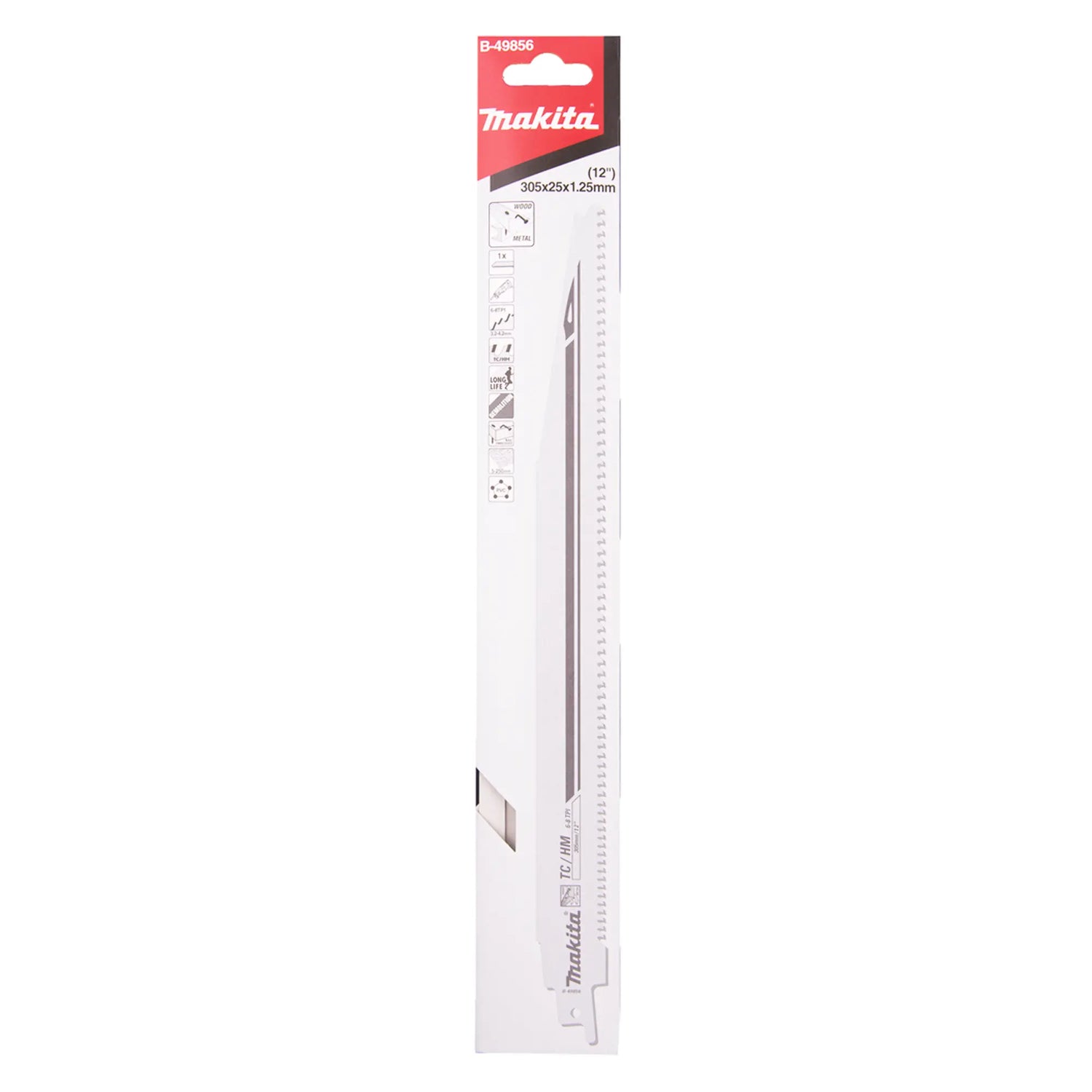 Allá Lama Makita B-49856 305 mm está diseñado para garantizar Alto rendimiento en operaciones de corte pesado, en materiales difíciles como madera con clavos, metal, plástico reforzado y paneles compuestos.
