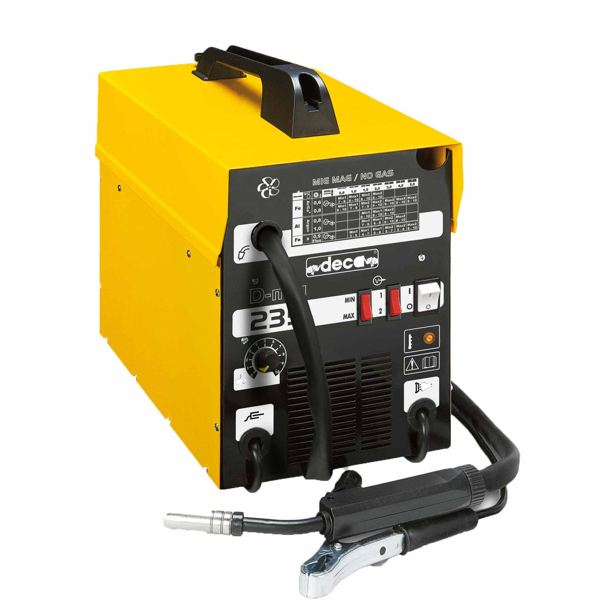 Planta de soldadura Deca D-MIG 235, en el cable MIG/MAG 1 fase - 230 V 50/60 Hz. El D-MIG 235 suministra 120 amperios en corriente continua.