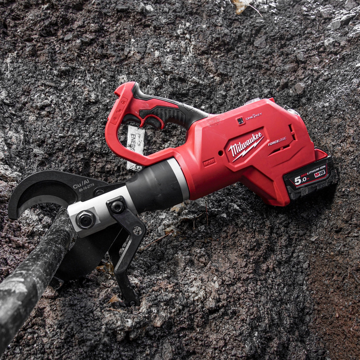Cortador de cables Milwaukee M18 HCC75R-502C 18V 5Ah, FORCE LOGIC capaz de cortar cables en menos de 10 segundos con 77,8 kN de fuerza. El control remoto inalámbrico se comunica con la herramienta a través de una conexión Bluetooth, eliminando cualquier conexión física con la herramienta y permitiendo al usuario realizar cortes remotos hasta 30 m de distancia.