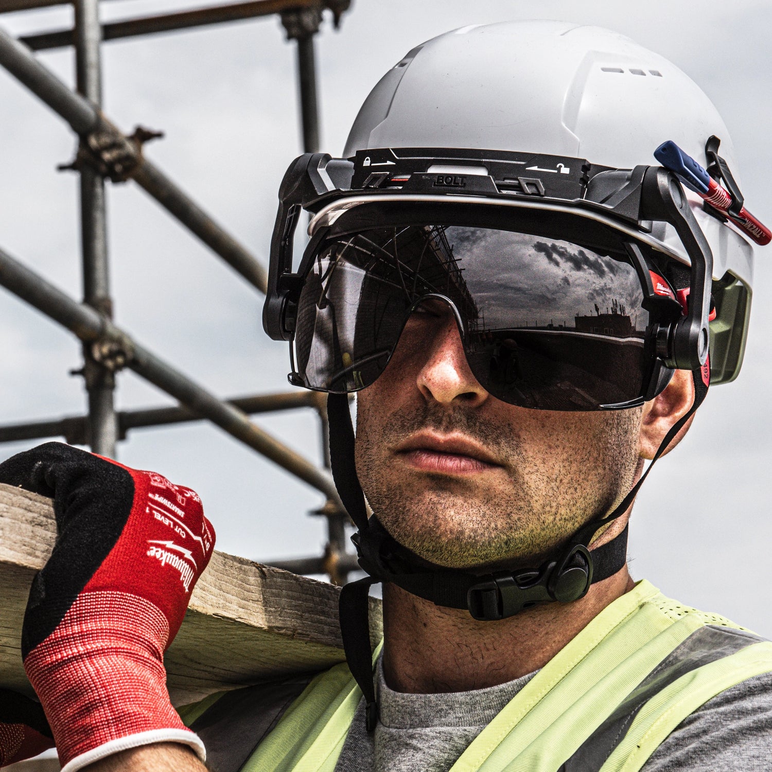 La visera Milwaukee BOLT Compacto Oscuro Está diseñado para garantizar una protección óptima y una visibilidad panorámica, perfecto para trabajar en entornos exteriores con luz solar intensa.